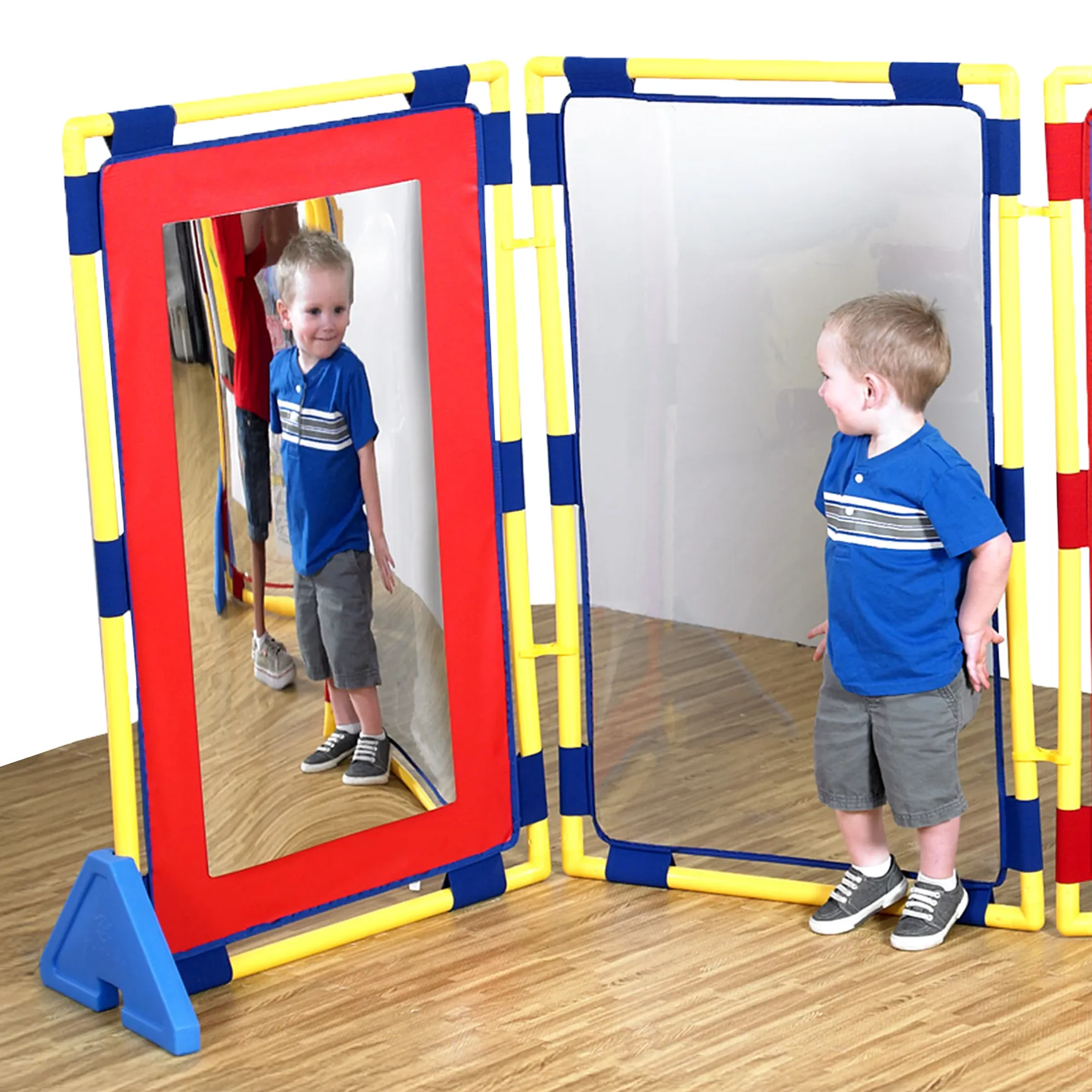 Divide the room and multiply the fun! Section off part of a room, or create different activity areas with these interactive room dividers. Each panel in this four part set offers a different sensory or developmental benefit. Kids get tactile input from the “fuzzy loop” panel and practice body awareness with the full child-sized mirror. Develop fine motor skills and showcase artwork on the art display panel. These easy-to-clean and easy-to-store panels are a great way to maximize space and increase sensory opportunities in your classroom, therapy center or home.