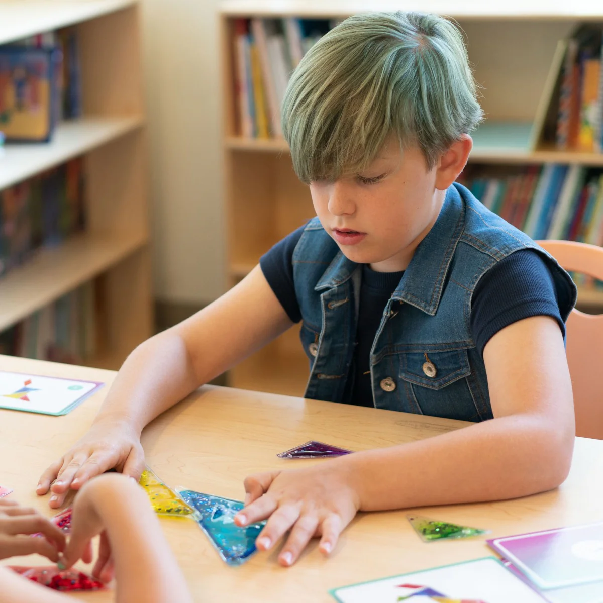Our gel tangrams are better than ever! Soft and squishy, the glittery gel-filled tangram shapes keep both fingers and minds busy. Squeeze the seven colorful shapes as you solve tangram puzzles found on our Tangram Cards. Can you use all seven pieces to form a square? Can you make a house or boat? Be creative! There are thousands of pictures you can create on your own. Terrific tool for enhancing focus, attention and fine motor coordination.