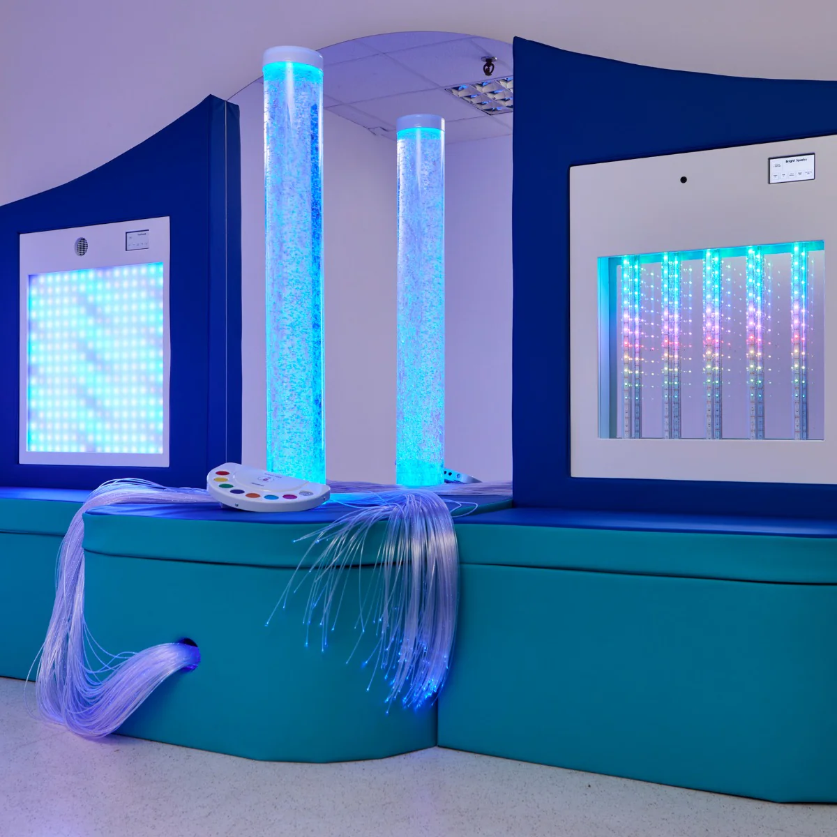 The all-in-one sensory station! The Interactive Calming Station maximizes your space by combining several sensory elements into one sleek, wall-mounted unit (see details for the full list of features). Soothing lighting provides mesmerizing visual experiences, while the soft padded bench gives kids a comfortable place to sit. And the best part? The benches double as built-in storage, with ultra-convenient lift-up lids. Product update: Our 8-Way Remote now features a safer power source — standard AA batteries (no more lithium rechargeables).