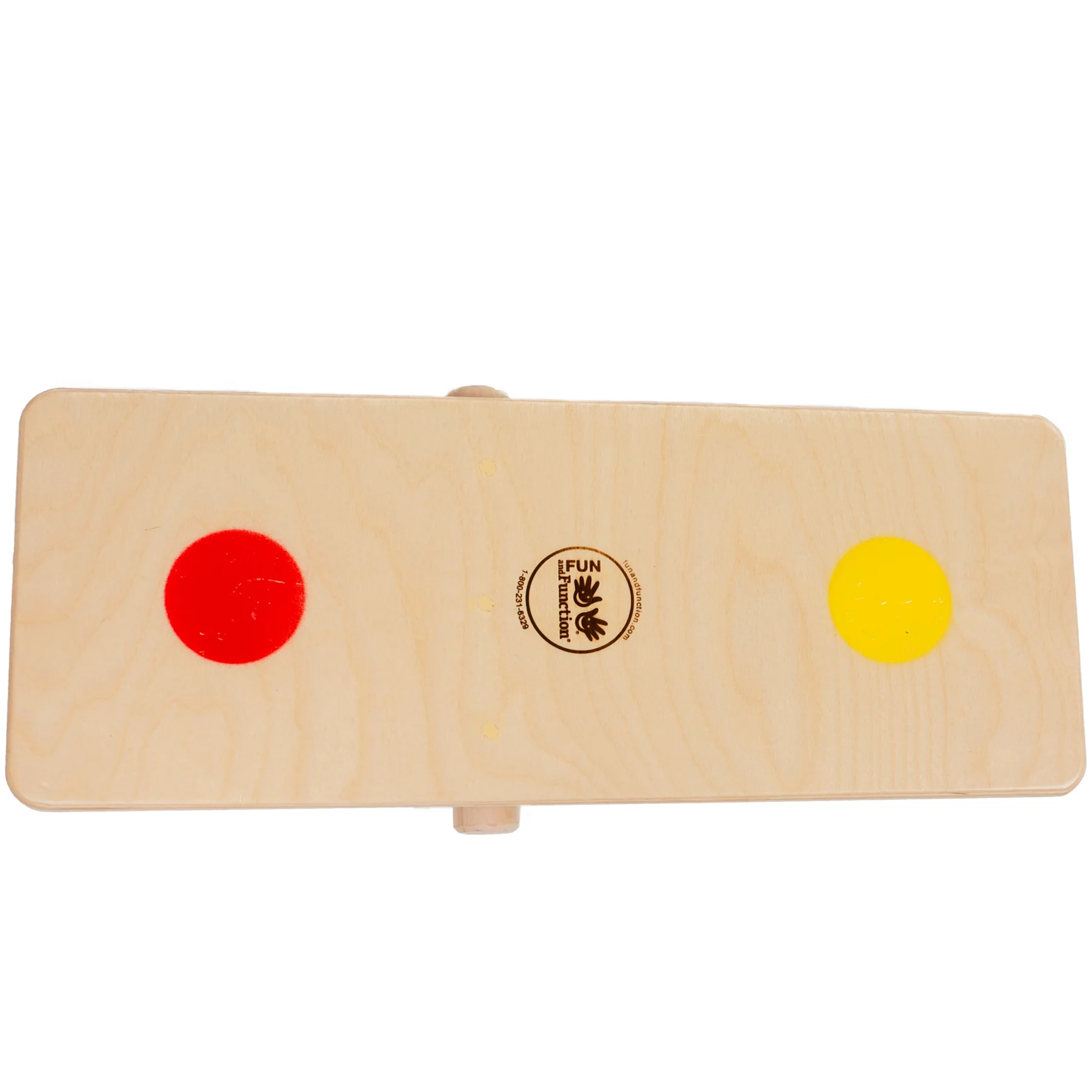 - Place a bean bag (sold separately) on the yellow dot on one side of the board and stomp on the red dot. Can you catch the beanbag as it flies into the air?